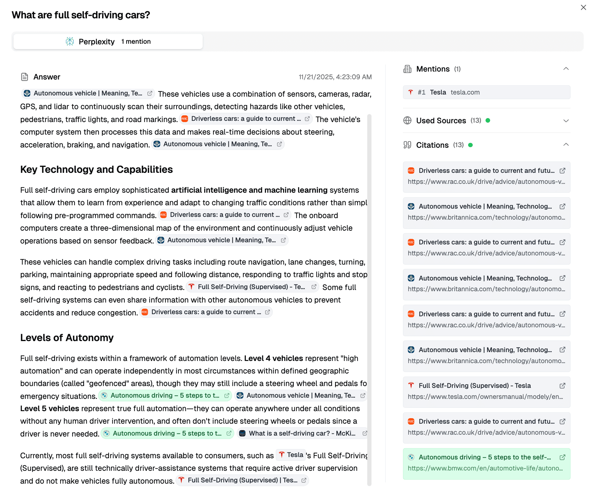 See every detail of your AI answers: Brand mentions, search queries, as well as sourced and cited web pages - for your brand and for all competitors.
